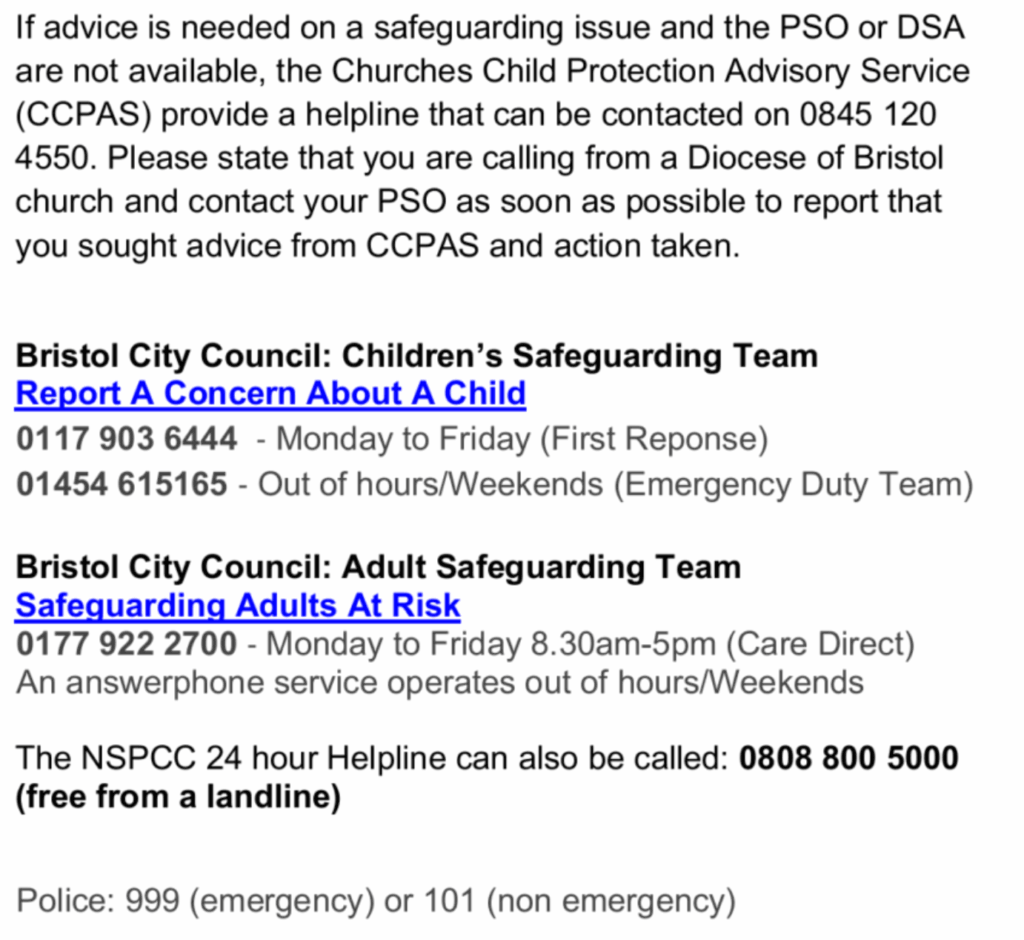 The link to Bristol Diocese Safeguarding website and other contact details can be found here: https://www.bristol.anglican.org/safeguarding/